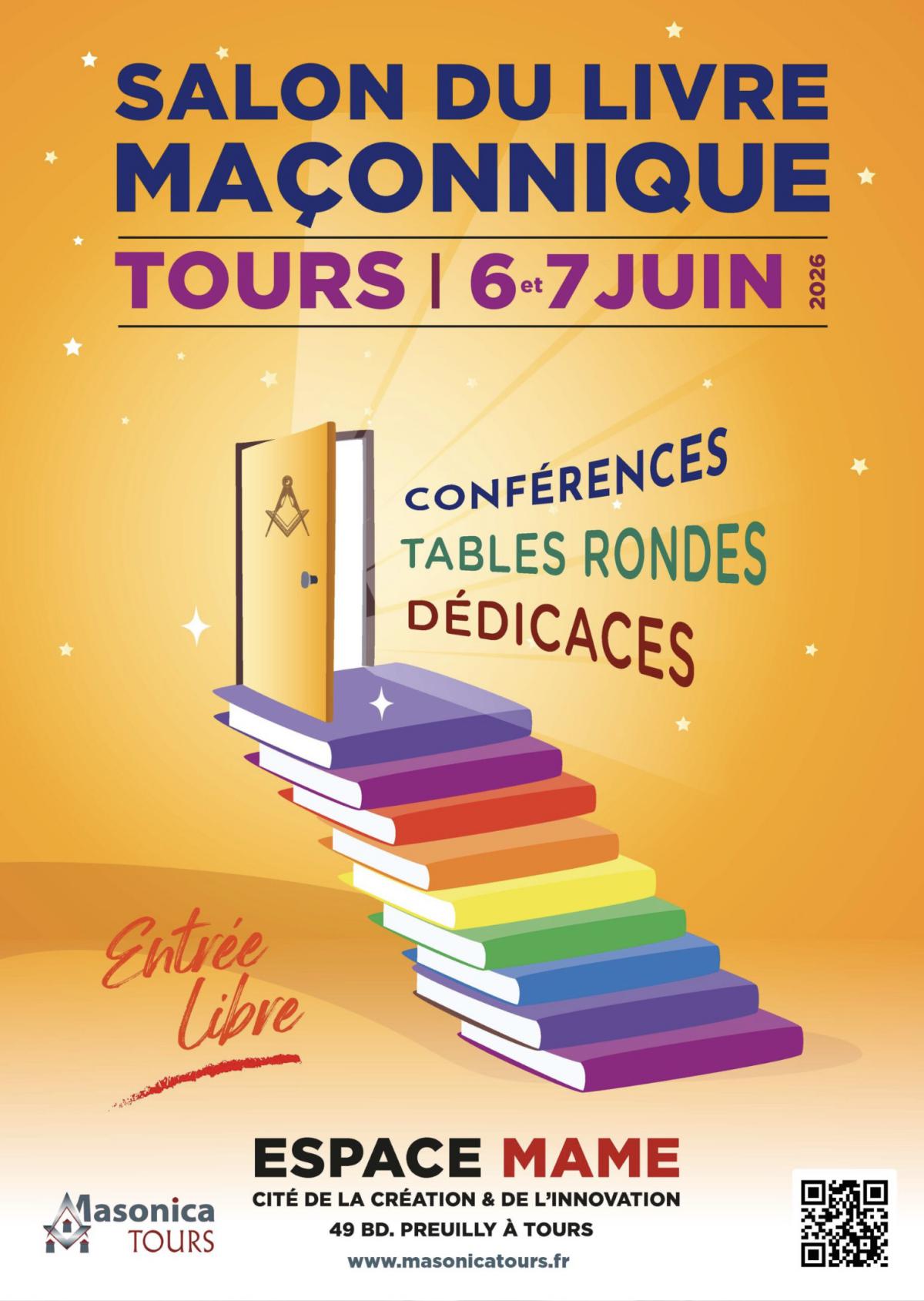 La deuxième édition du livre et de la culture maçonnique « Masonica Tours » aura lieu le samedi 6 juin 2026 et le dimanche 7 juin 2026. Il se tiendra à MAME, cité de la création et de l’innovation, 49 boulevard de Preuilly à Tours.